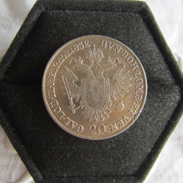 パリのアンティーク市で見つけたオーストリア帝国1832年20クロイツァー銀貨ボタン 表はオーストリアの象徴双頭の鷲 裏はフランツ2世の肖像 釦にしたのは近年の様です。 銀583/1000 サイズ:φ26mm高さ5mm(足含む)