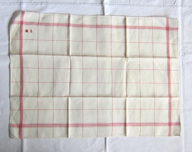 パリのブロカントで見つけた手刺繍イニシャルMLが施されたヴィンテージのキッチンクロス1枚