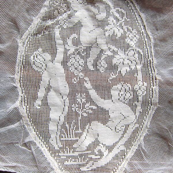 パリのアンティーク市で見つけたチュールレースに3人の天使の様な子供が葡萄の木の下で遊んでいるフィレレースが施されています