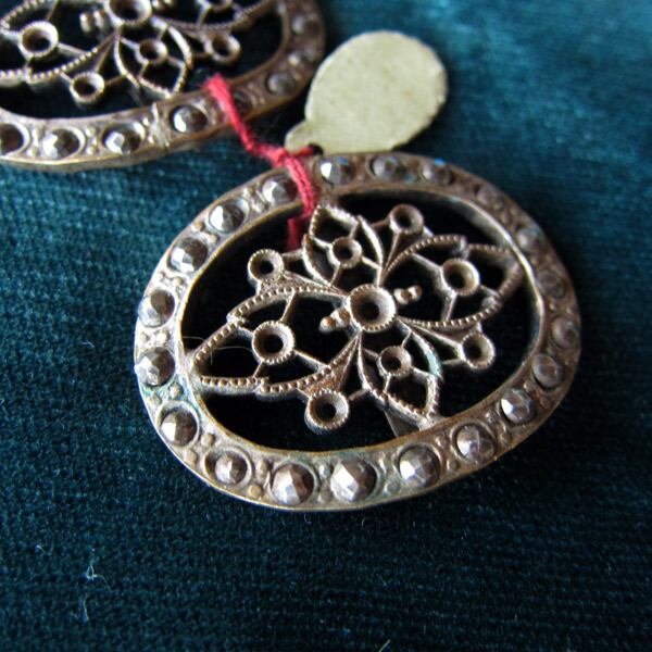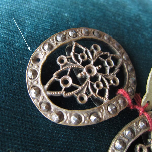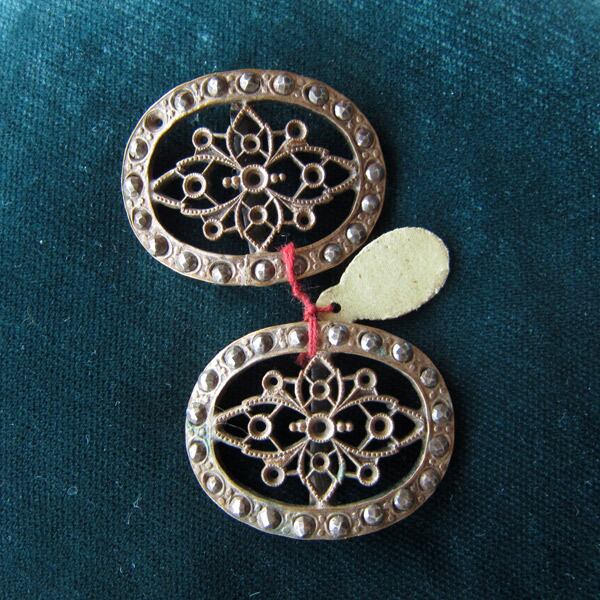 ヘムにスチールカットが並んだ古いベルトバックルのパーツ