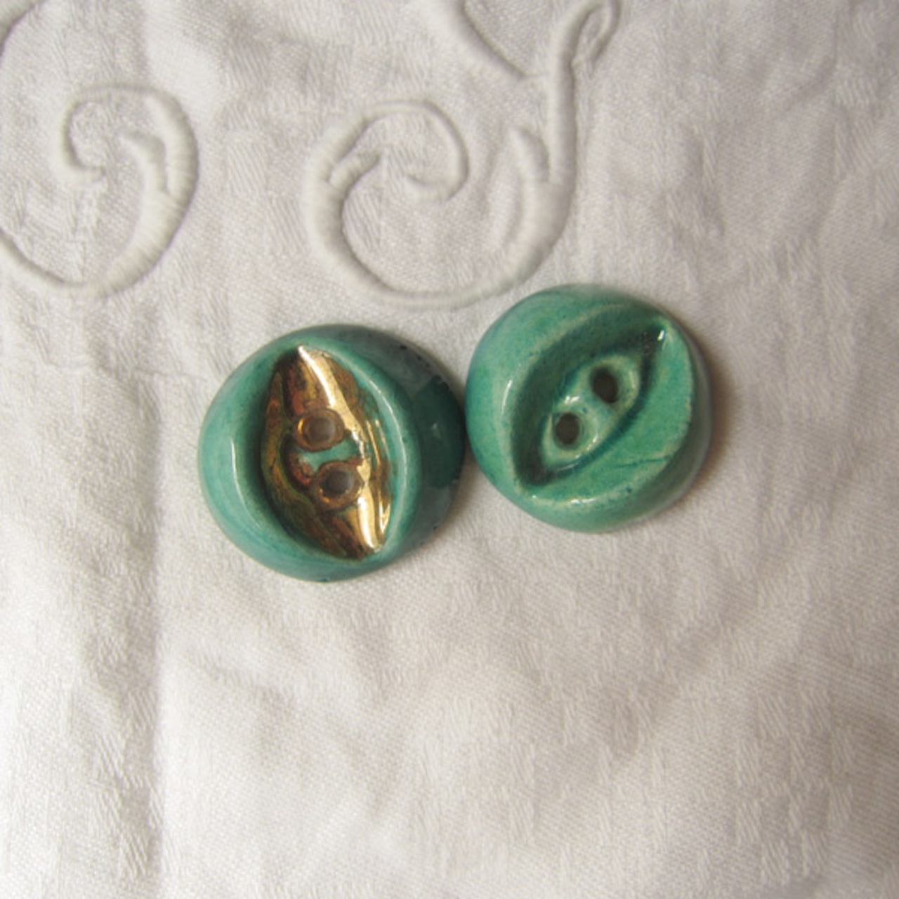≪28mm2個≫陶器ボタン 猫目 エメラルドグリーン 金彩 フランスヴィンテージ