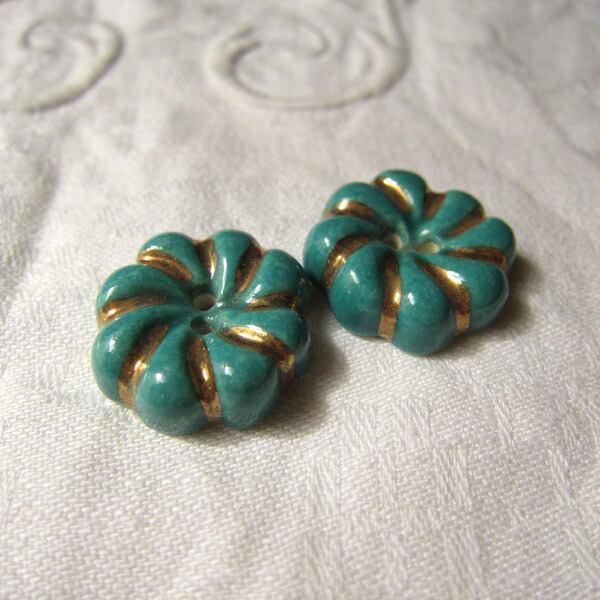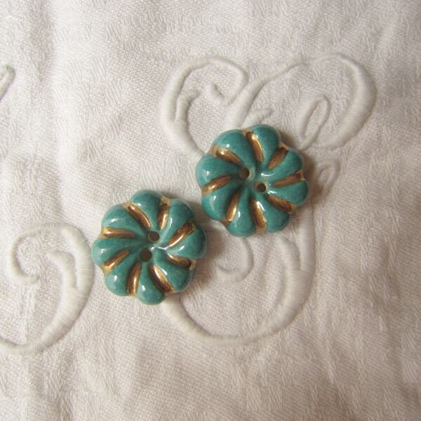 ≪19mm2個≫陶器ボタン ターコイズグリーン 金彩 フランスヴィンテージ