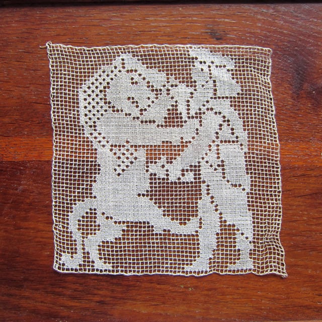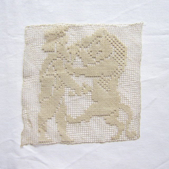 フランスアンティーク 麻フィレレース モチーフ 神話 ライオンと戦士