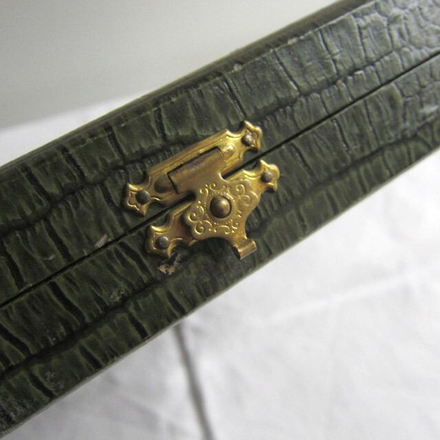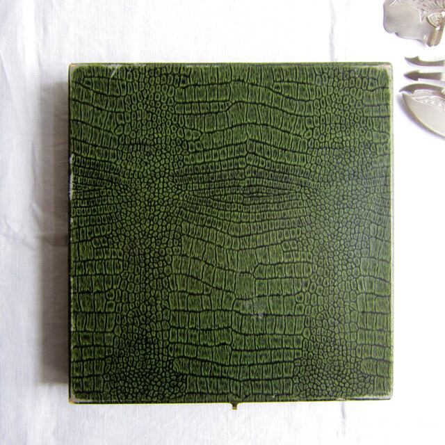 ダークグリーンのクロコ柄化粧箱に入っています。