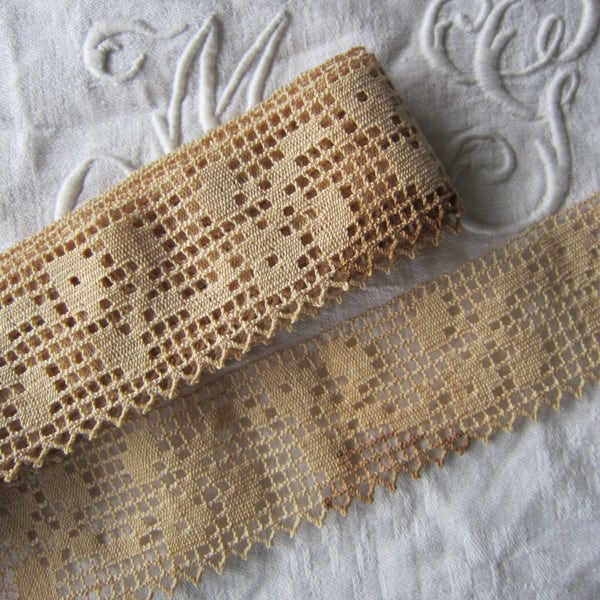 パリのアンティーク市で見つけた紅茶色リーフガーランドのフィレレース282cm強