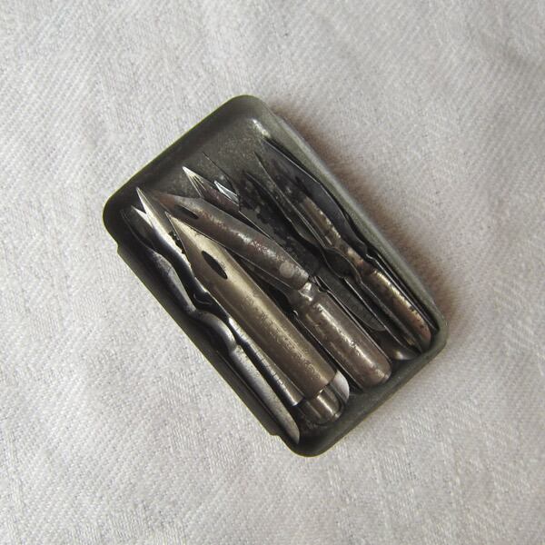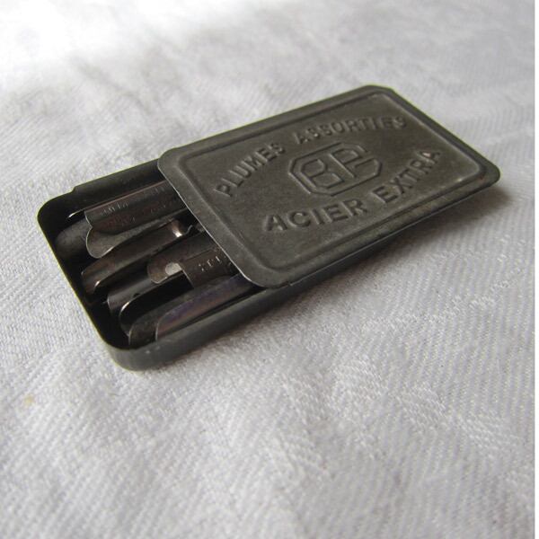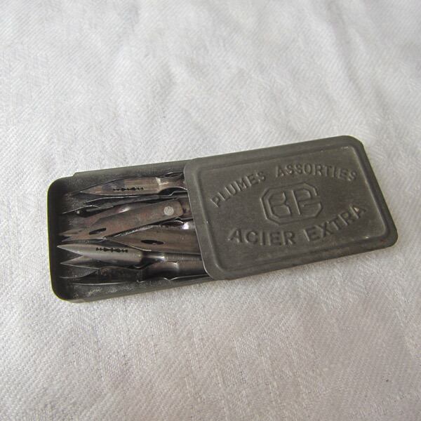 パリのアンティーク市で見つけた古いペン先20本入のティン缶