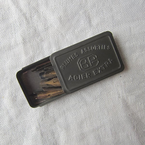パリのアンティーク市で見つけた古いペン先30本入のティン缶