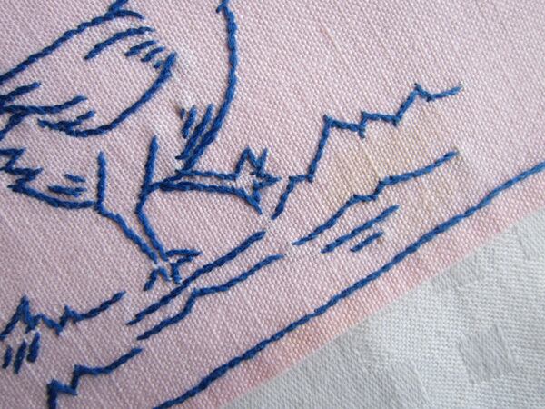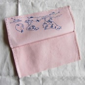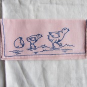 パリのアンティーク市で見つけたピンク麻生地に卵と鳥の親子がブルーの手刺繍が入ったナプキン&カトラリーケース