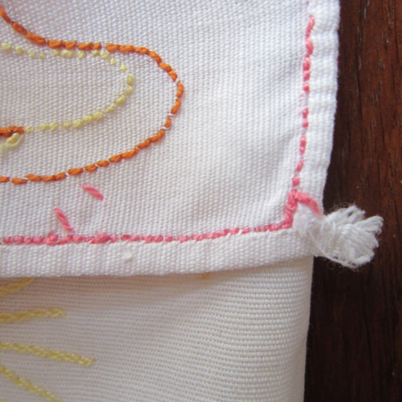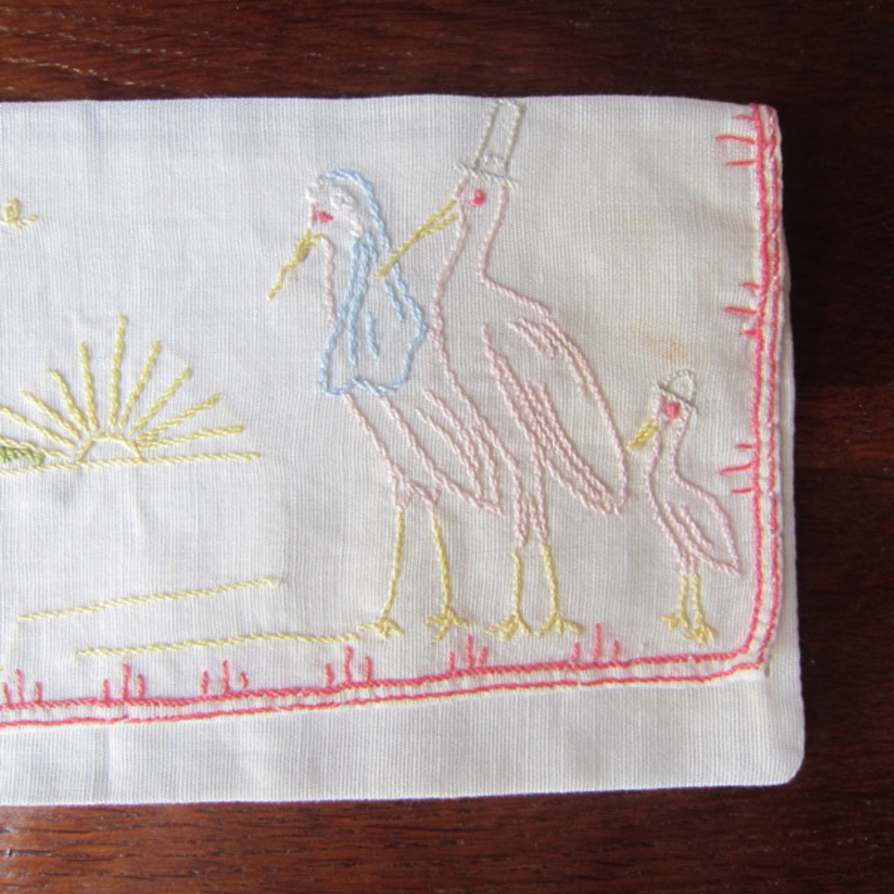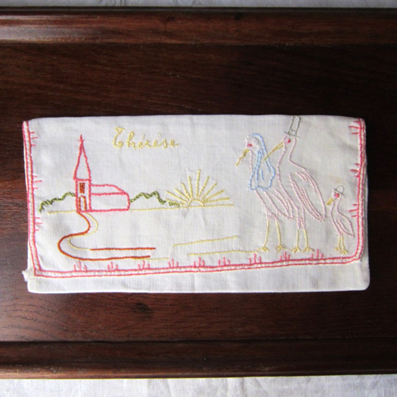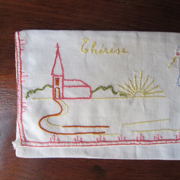 パリのブロカントで見つけたアルザス地方のシンボルコウノトリ親子と教会の刺繍入り