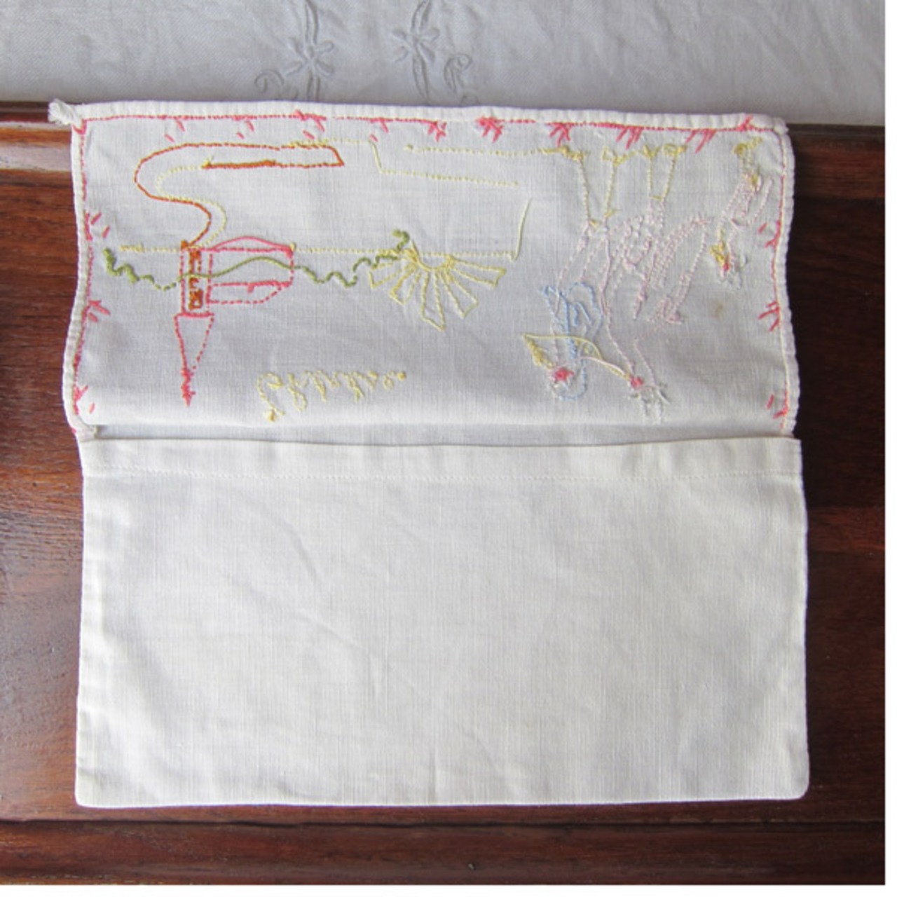 フランスヴィンテージ 教会コウノトリ親子 手刺繍 ナプキンケース 麻リネン 小物入