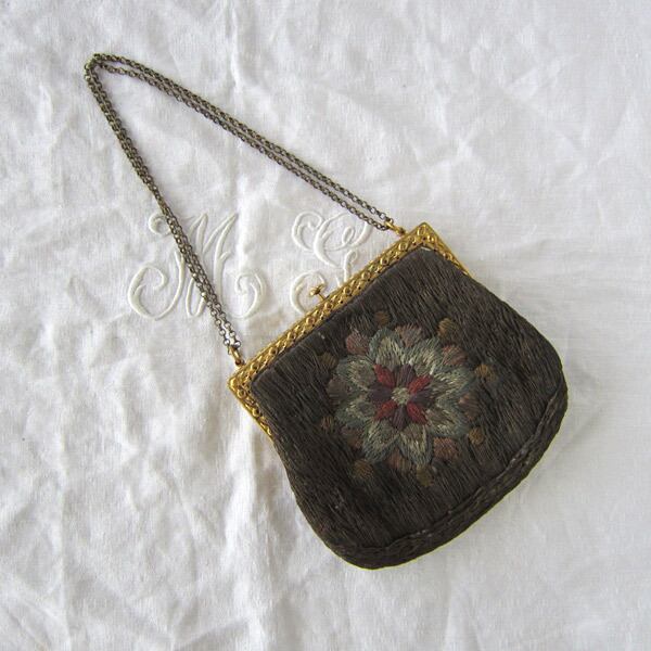 フランスアンティーク市で見つけた薔薇とリーフが素敵な口金の手刺繍バック